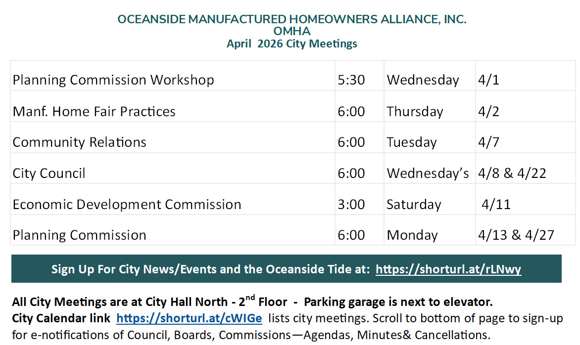 Our mission is to inform, educate and unite our homeowners living in all 17 of Oceanside’s manufactured home parks. OMHA, a 501-C4 non-profit, supports candidates running for office by volunteering and contributing to elections, for those who support Oceanside’s 16B Rent Control Ordinance. Our board interacts with our Mayor, Council, Housing Director and Commissioners on important issues, rights, and decisions that affect all our homeowner’s. Improving the city’s mandates and holding park owners accountable in compliance with the city’s ordinance’s and the MRL (State of California’s Mobilehome Residency Laws) are OMHA’s core priorities.